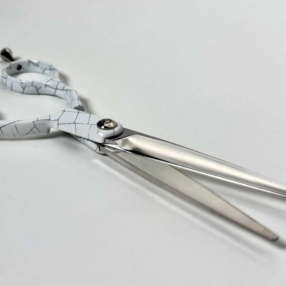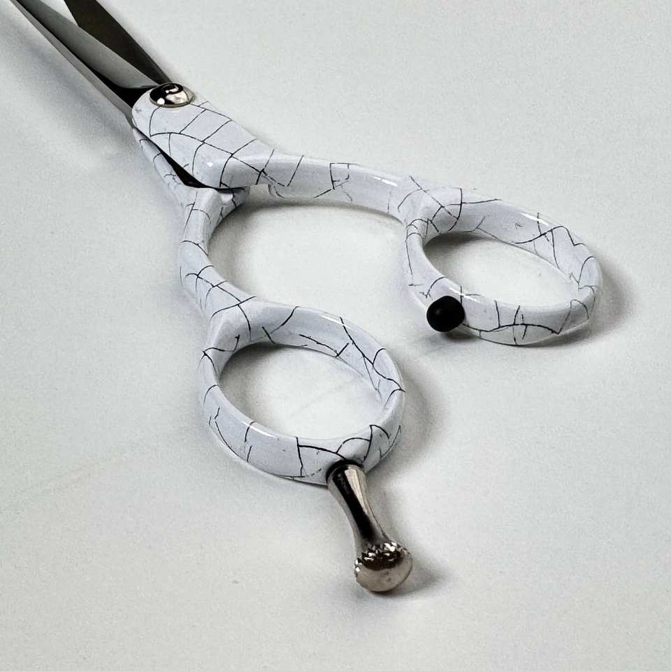 กรรไกรตัดผมปลายแหลมคมกริบ ทำจากสแตนเลสคุณภาพสูง ปรับแต่งได้ ขนาด 5.5 นิ้ว ใบมีดตรง สำหรับคนถนัดขวา สีขาวลายแตก