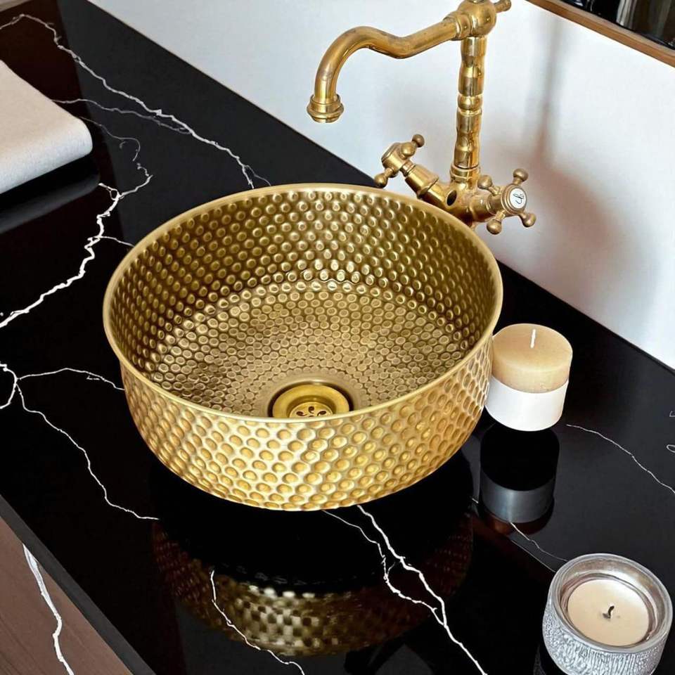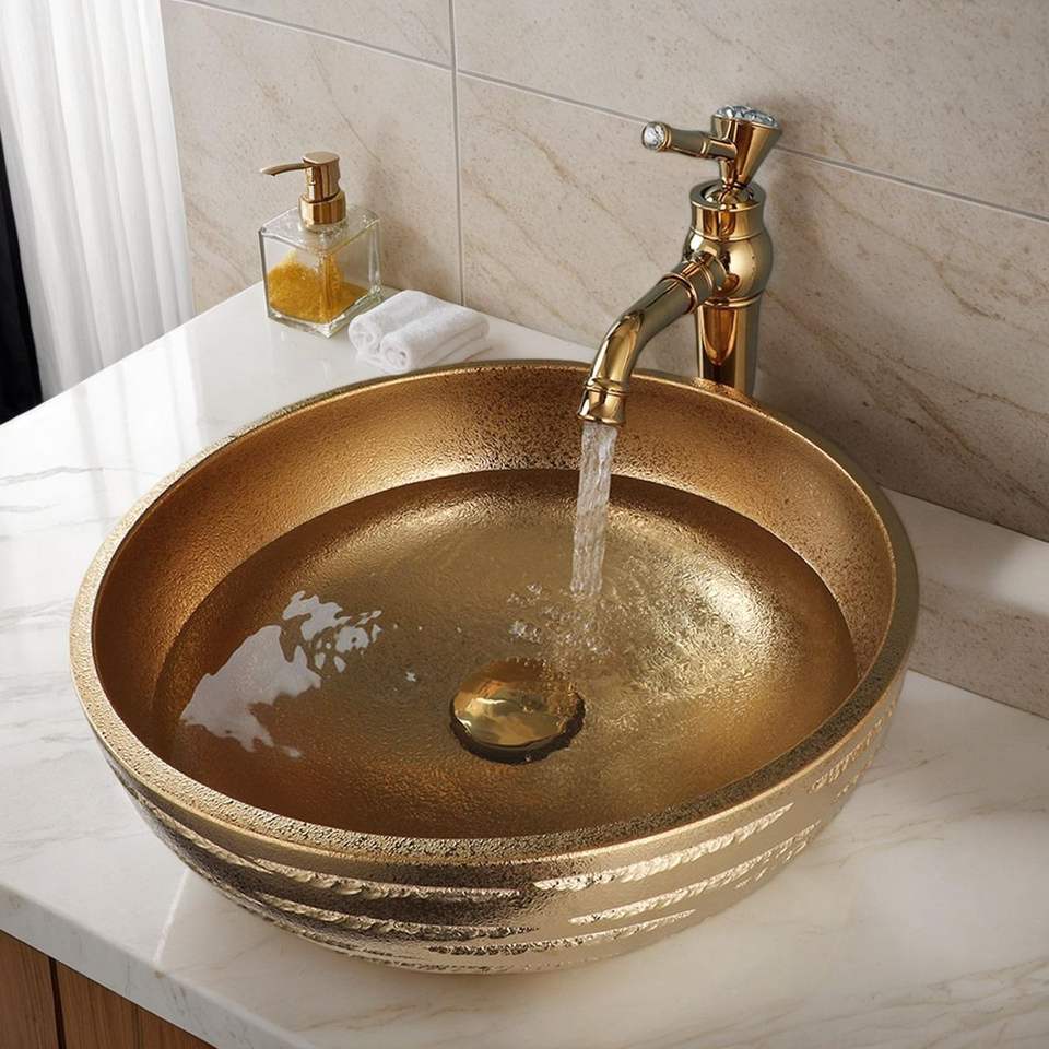 อ่างล้างหน้าทองเหลืองตกแต่งระดับพรีเมียม อ่างล้างหน้าแบบวางบนเคาน์เตอร์สำหรับห้องน้ำสุดหรู ดีไซน์สีทองสำหรับตกแต่งภายในบ้าน โรงแรม และร้านอาหารสไตล์โมเดิร์น