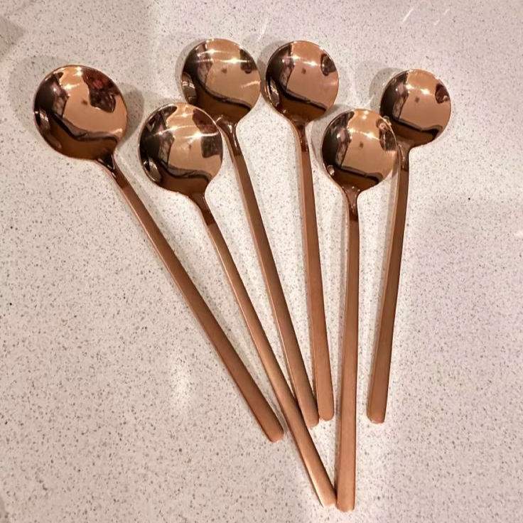 ชุดช้อนส้อมดีไซน์พรีเมียม ขัดเงาอย่างดี สีโรสโกลด์ ผลิตจากสแตนเลสสตีลแบบกระจก เหมาะสำหรับใช้ในโรงแรมและร้านอาหาร