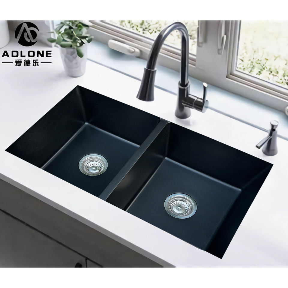อ่างล้างจานคู่ดีไซน์พรีเมี่ยมพร้อมแผ่นระบายน้ำจากโรงงานงานฝีมือควอตซ์เทียมคุณภาพสูง