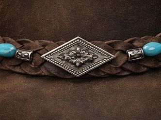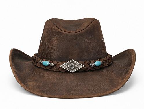 หมวกคาวบอยหนังสีน้ำตาลแบบพรีเมียมสำหรับผู้ชายและผู้หญิง หมวกสไตล์ตะวันตกทำมือพร้อมสายถักประดับลูกปัดสีฟ้าคราม