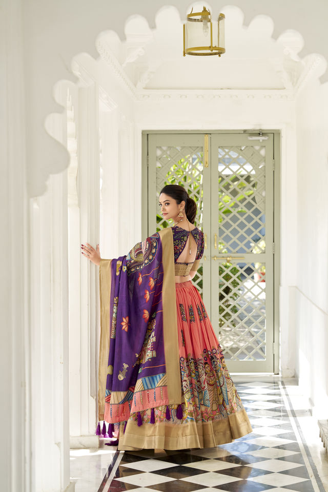 Lehenga choli ผ้าไหมพรีเมี่ยม dola กับ kalamkari อินเดียทอชายแดนดูกัตตาที่สง่างามสวมใส่ชาติพันธุ์ที่สง่างามสำหรับงานแต่งงานและเทศกาล