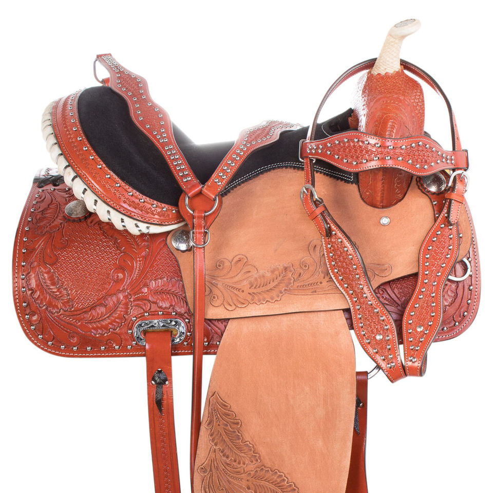 ชุดอานม้าภาษาอังกฤษทนทานแบบพรีเมี่ยม14 "-18" "บาร์เรลแข่งม้าตะวันตกแทคสีต่างๆทำจากหนังแท้