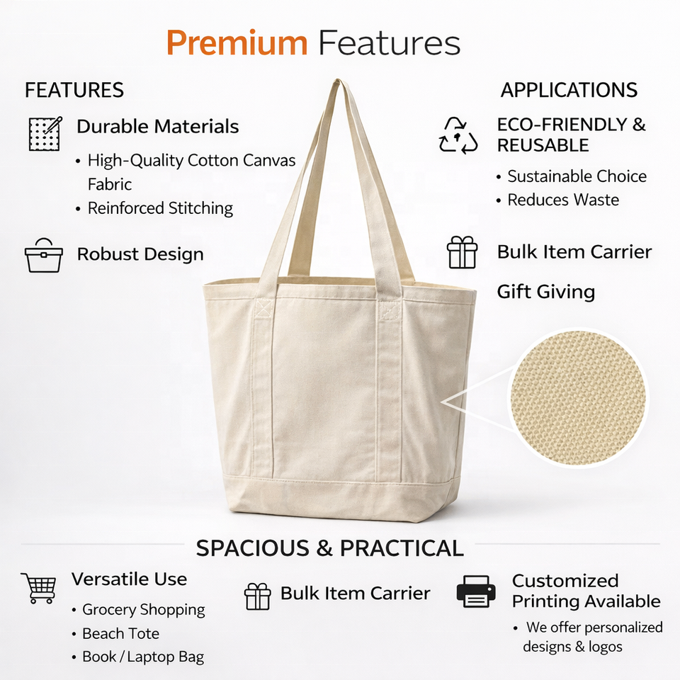 ถุงช้อปปิ้งผ้าฝ้ายพรีเมียมรักษ์โลก พร้อมหูหิ้วแบบแปะ ขอบกว้าง ใช้ซ้ำได้ ย่อยสลายได้ เหมาะสำหรับใส่ของชำ ของใช้ประจำวัน ไปเที่ยวทะเล ใช้ได้ทุกวัน