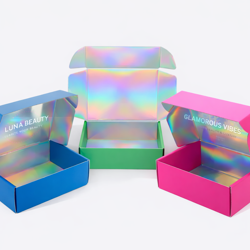 กล่องบรรจุภัณฑ์เครื่องสำอางแบบกำหนดเอง ทำจากวัสดุรีไซเคิลรักษ์โลก พรีเมียม กล่องไปรษณีย์ลูกฟูกสำหรับผลิตภัณฑ์ดูแลผิว พร้อมเอฟเฟกต์โฮโลแกรม