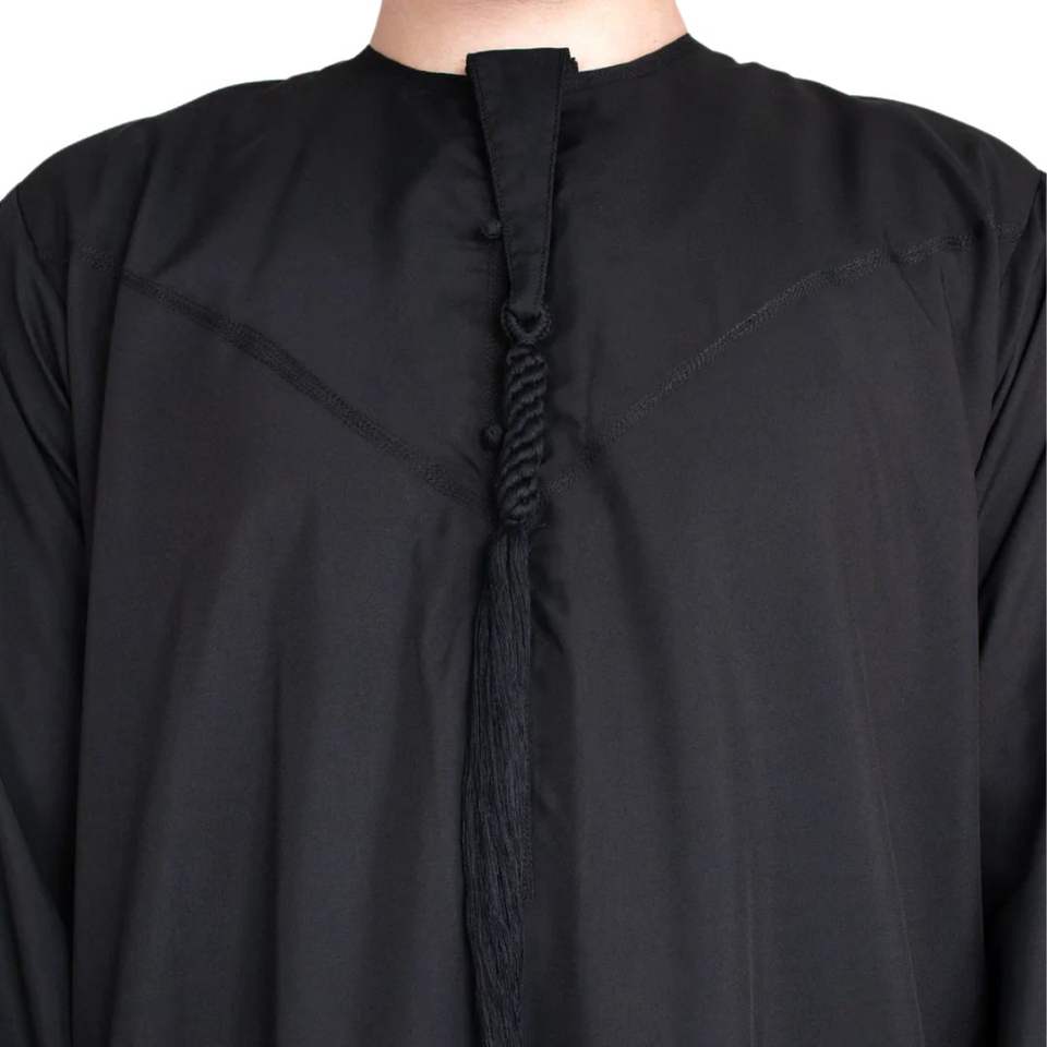 ชุดคลุมแบบดั้งเดิมของชาวอาหรับ คันดูราสีดำสุดหรู พรีเมียม ผ้าเนื้อนุ่ม ระบายอากาศได้ดี ชุดอิสลามสมัยใหม่สำหรับผู้ชาย