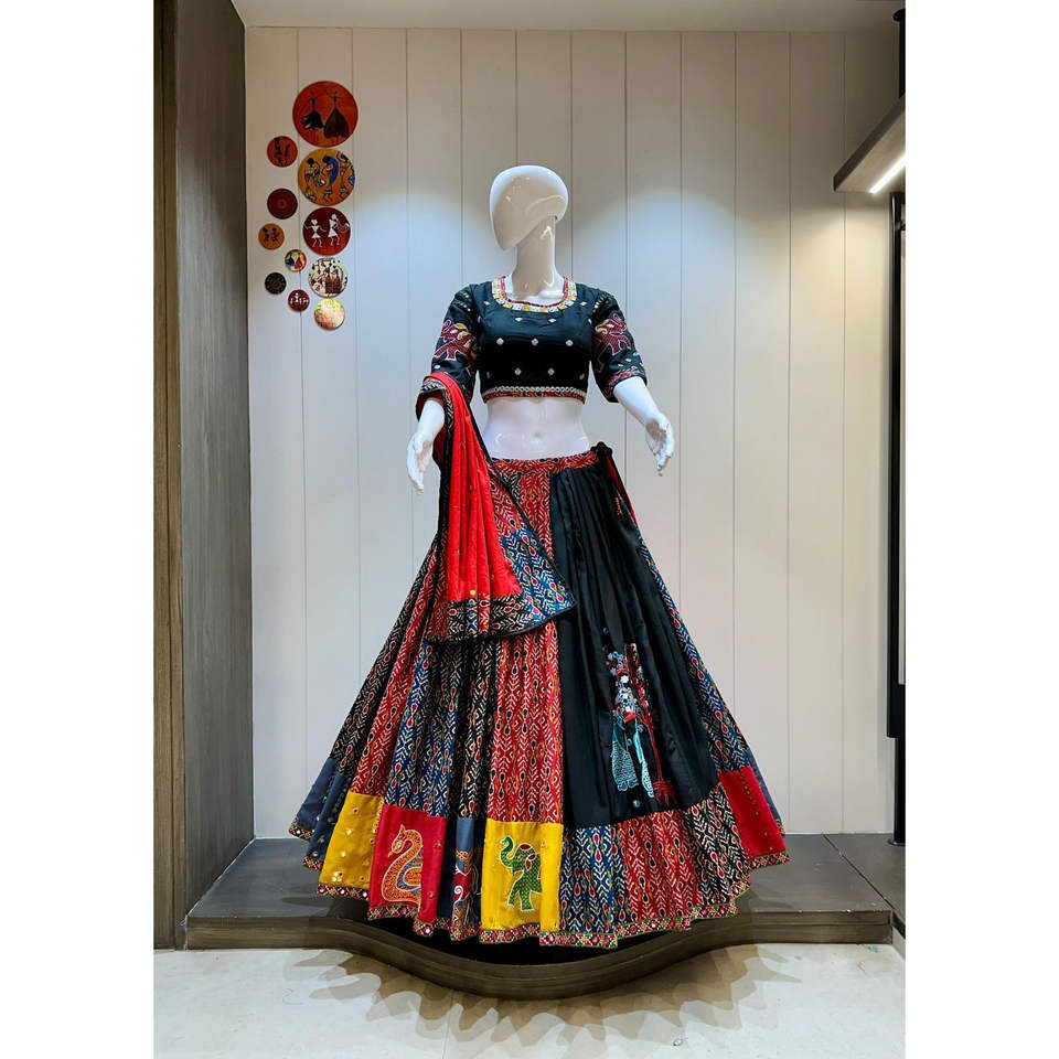 ชุดชานียาโชลีแบบดั้งเดิม พรีเมียม ไลฟ์สไตล์ลักชมี ผ้าฝ้ายแท้ พิมพ์ลายอิกกัต งานแฮนด์เมด ตกแต่งด้วยงานกัมธีอย่างประณีต ซึมซับความชื้นได้ดี