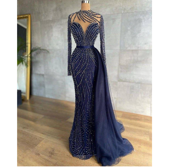 ชุดราตรีนางเงือกยาวถึงพื้นมีสไตล์สำหรับผู้หญิงประดับลูกปัดไข่มุกสำหรับตกแต่ง