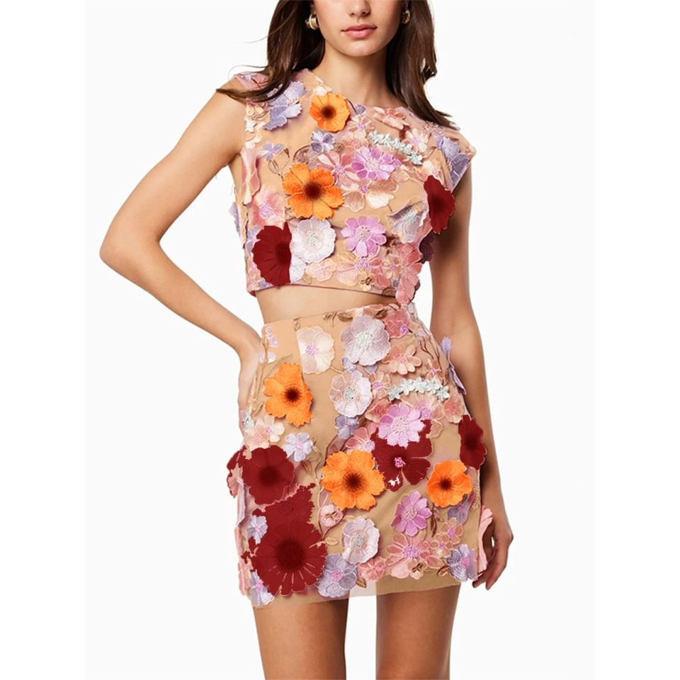 ชุดเซ็ต 2 ชิ้น เสื้อครอปแขนกุดปักลายโครเชต์สุดหรู พร้อมกระโปรง แฟชั่นสำหรับผู้หญิง
