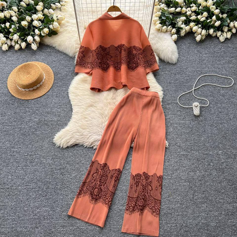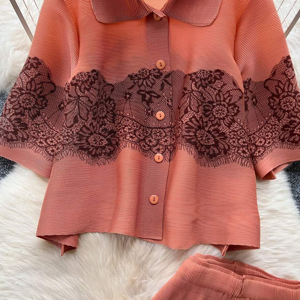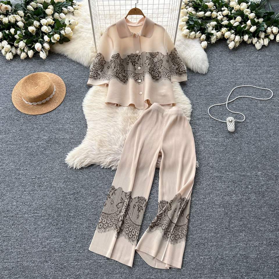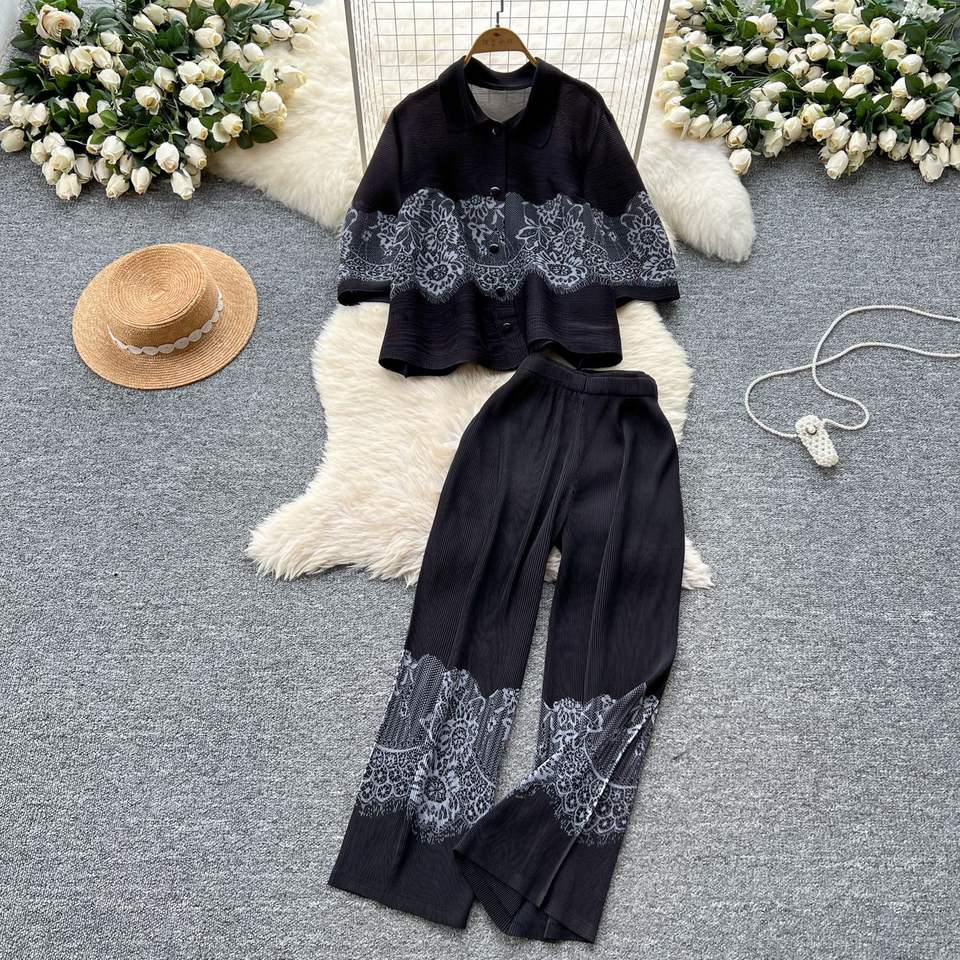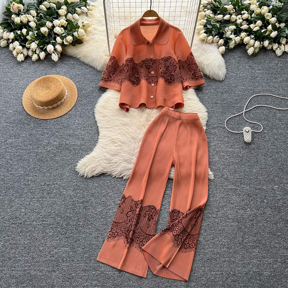 ชุด2ชิ้นกางเกงขากว้างเอวสูงเสื้ออัดพลีทคอปกทรงหลวมผ้าจีบสำหรับผู้หญิง
