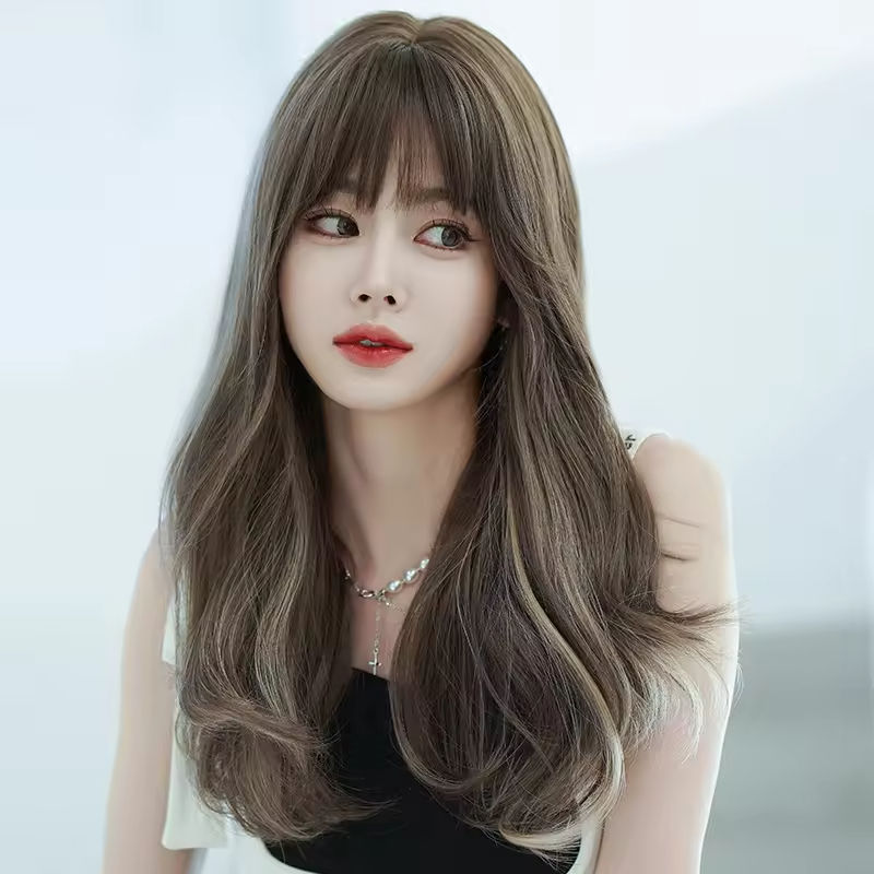 วิกผมใยสังเคราะห์คุณภาพสูง ทรงบอดี้เวฟ สีน้ำตาลไฮไลท์ธรรมชาติ พร้อมหน้าม้า สำหรับผู้หญิง ทนความร้อน แบบผมหยิกฟู ถักโครเชต์