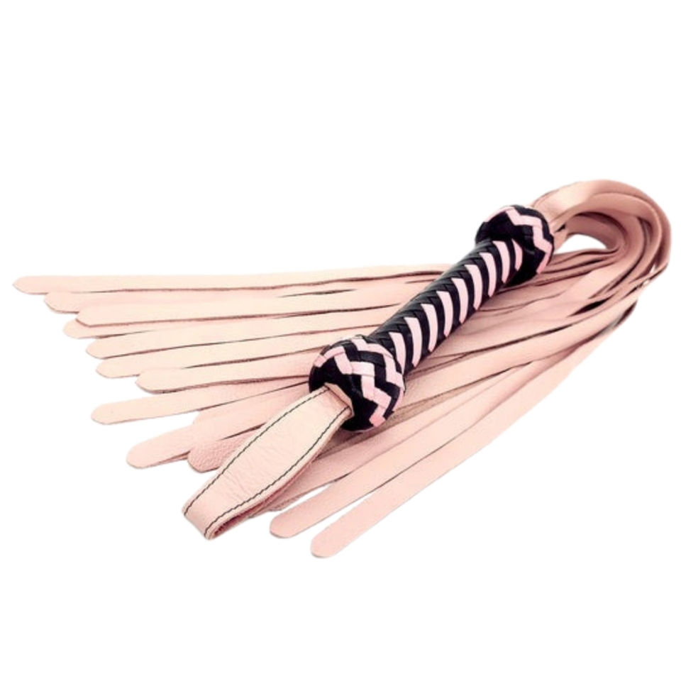 แส้หนังแท้สีชมพูอ่อนพรีเมียม พร้อมแถบสีดำและสีชมพูอ่อนครึ่งเส้น แส้ทำมือสุดหรู