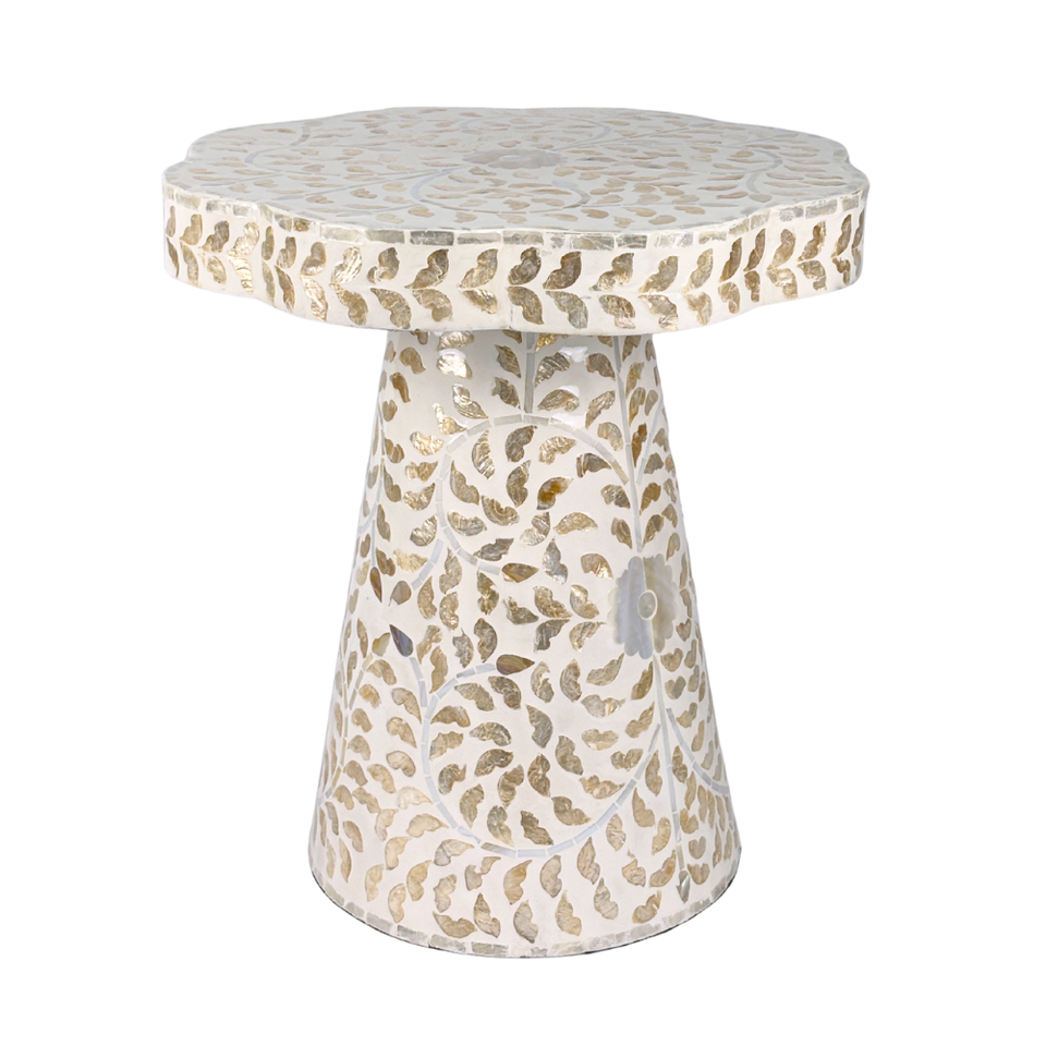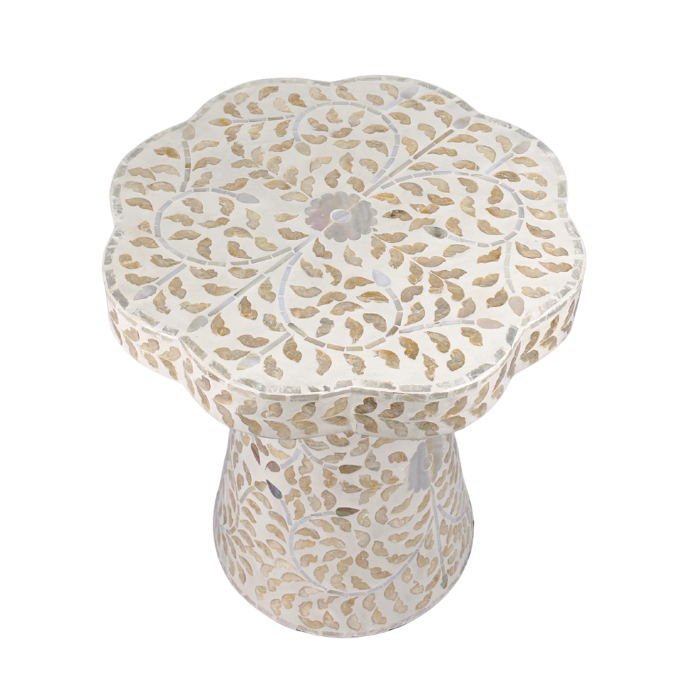 ม้านั่งแบบฝัง capiz รูปทรงดอกไม้แบบพรีเมี่ยมพร้อมลวดลายใบไม้โต๊ะข้าง MDF แฮนด์เมดสำหรับห้องนั่งเล่นเฟอร์นิเจอร์ตกแต่ง
