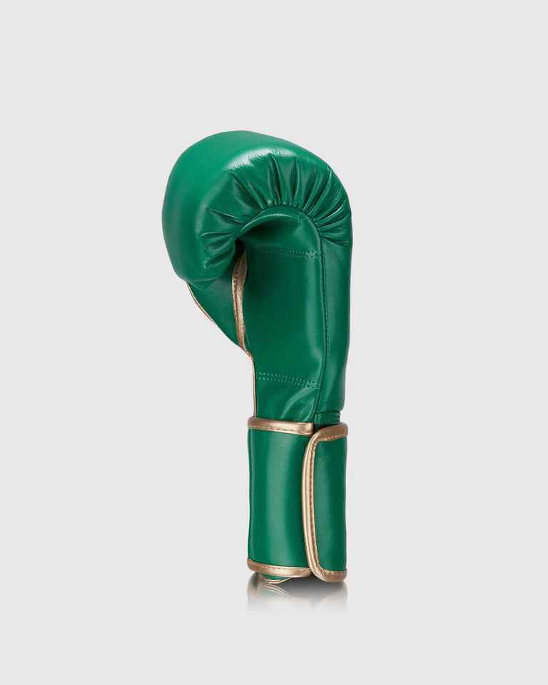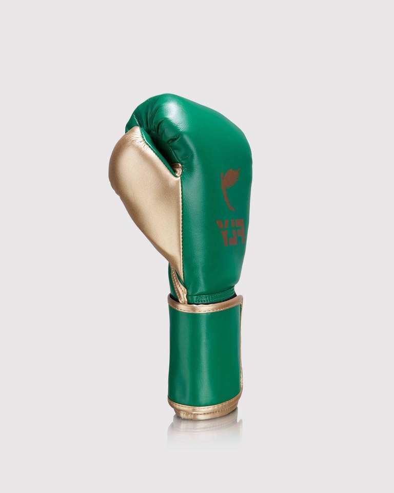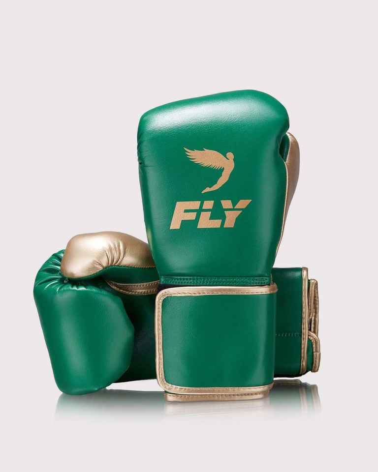 Premium Fly Sports Boxing Gloves in Green and Gold Fly Boxing Gear Luxury Leather Gloves High Performance Design