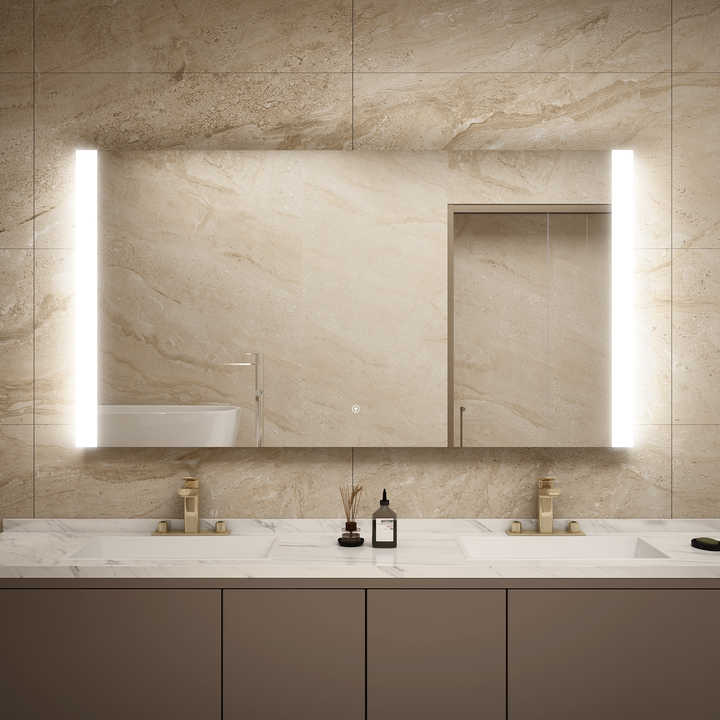 กระจกโต๊ะเครื่องแป้ง LED ทรงสี่เหลี่ยมไร้กรอบพร้อมแถบด้านข้างพ่นทรายและเรืองแสงสว่างสดใส