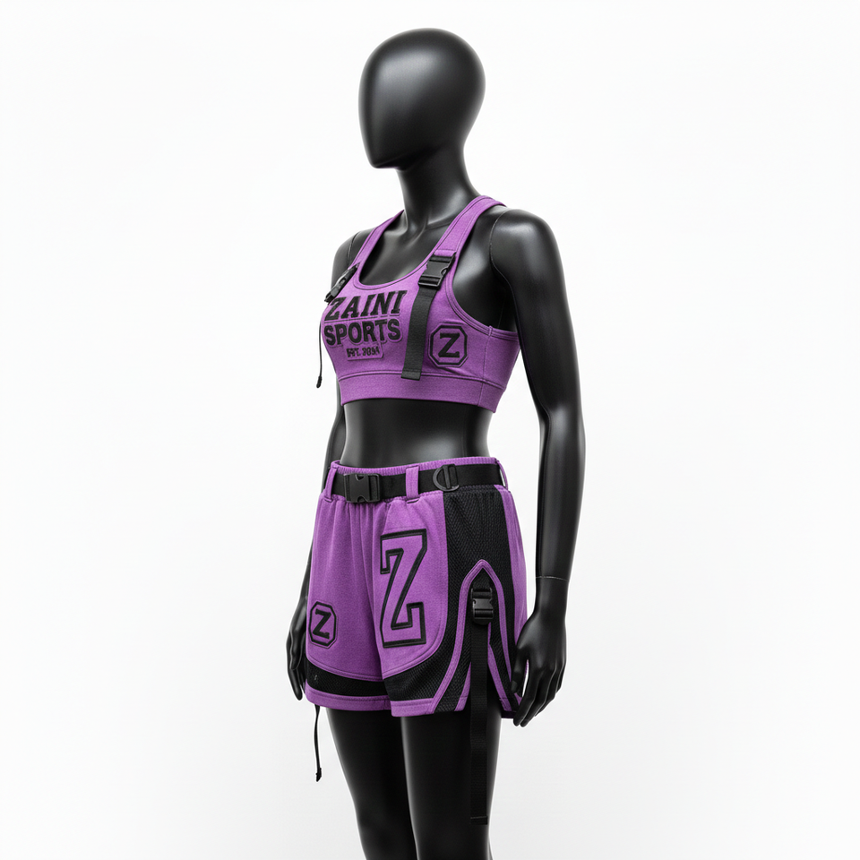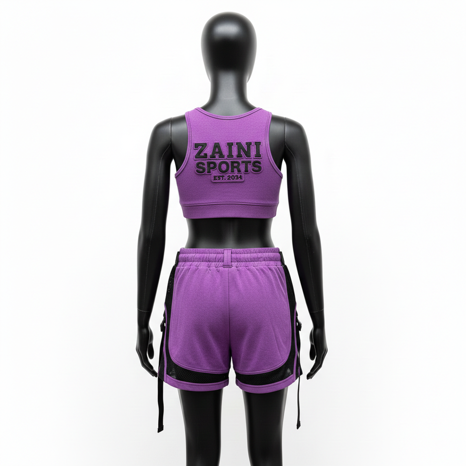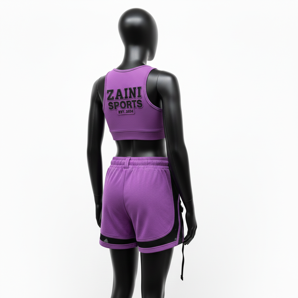 ชุดเซ็ตบอดี้สูทขาสั้นผู้หญิง ผ้าคอตตอนผสมโพลีเอสเตอร์และสแปนเด็กซ์ พรีเมียม GSM สีม่วงดำ แต่งผ้าตาข่าย พิมพ์ลายพัฟ พร้อมปักโลโก้ตามสั่ง