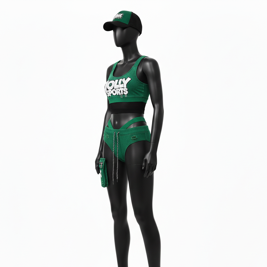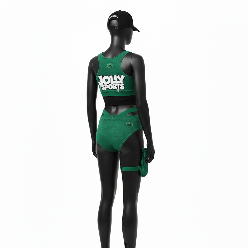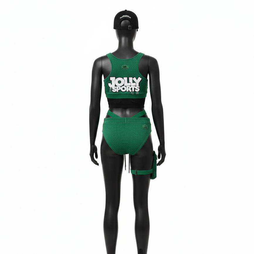 ชุดบิกินี่ผู้หญิงผ้าโพลีเอสเตอร์ผสมสแปนเด็กซ์แบบถักคุณภาพพรีเมียม สีเขียว แต่งแถบผ้า พร้อมปักโลโก้แบบ 3 มิติตามสั่ง