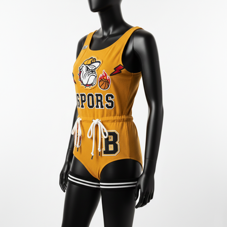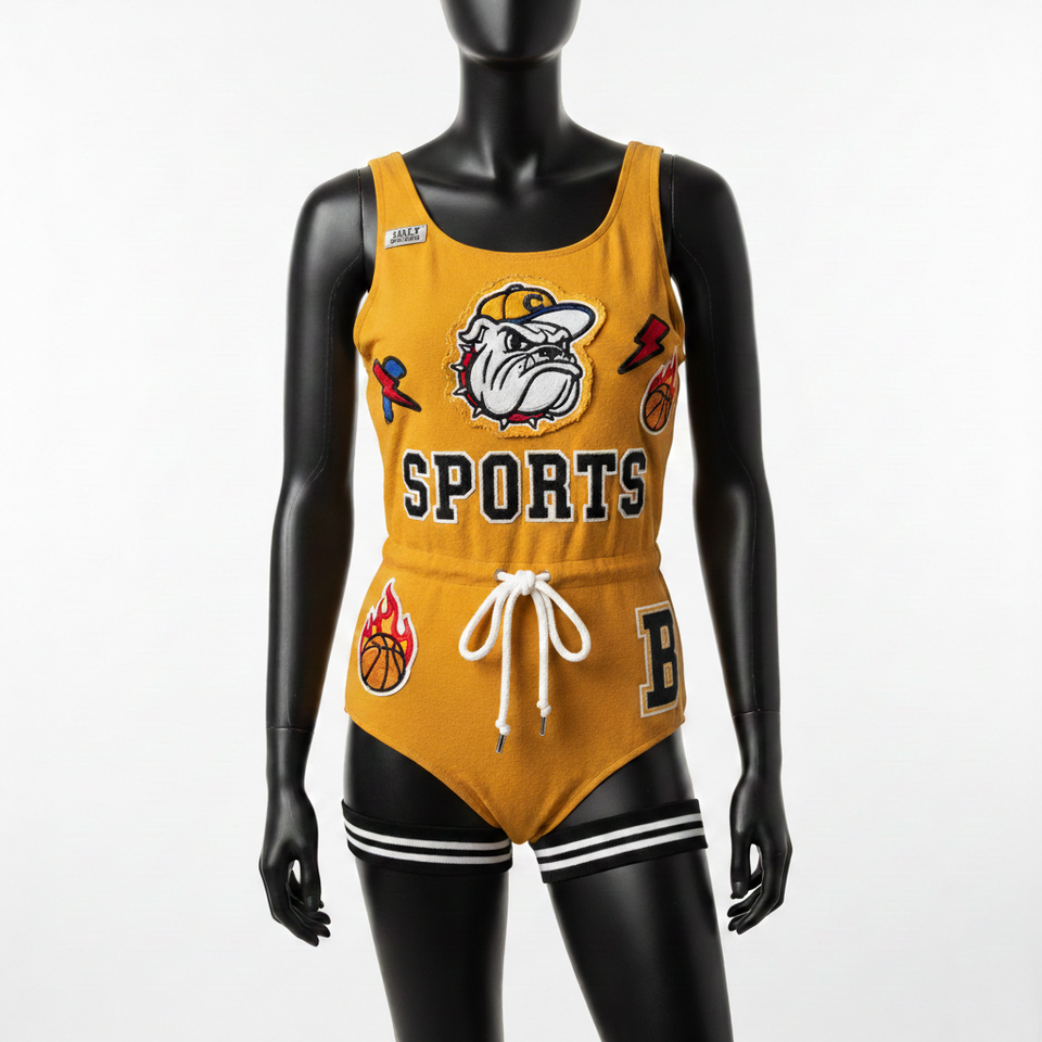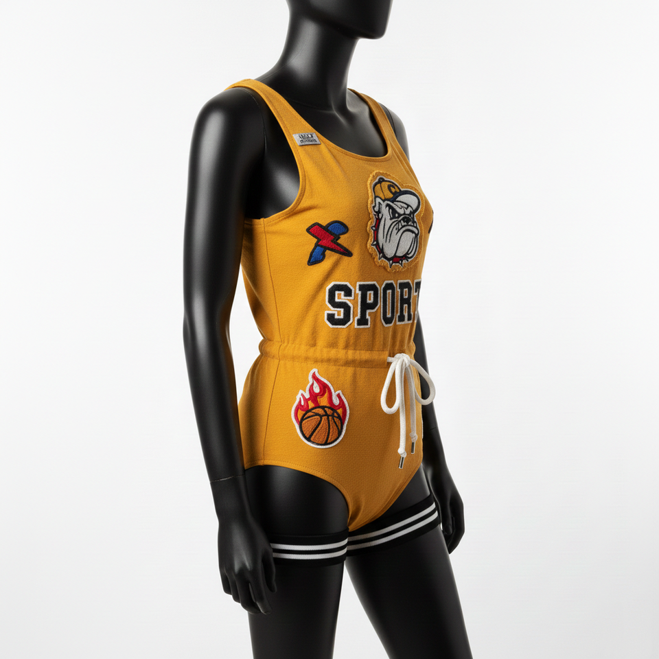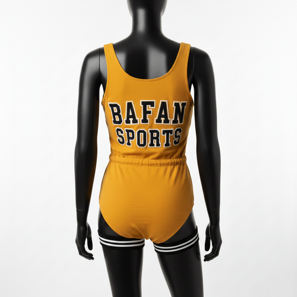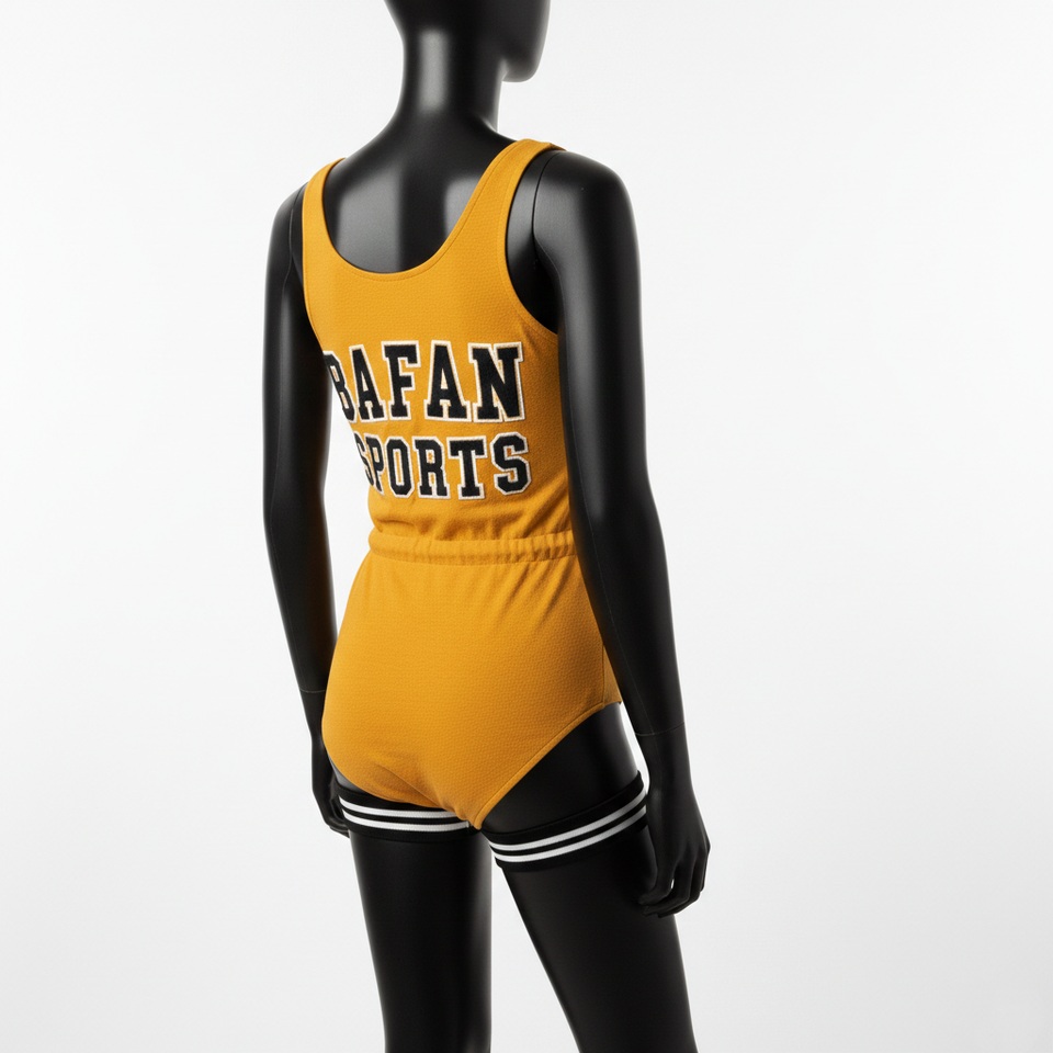 ชุดว่ายน้ำผู้หญิงพรีเมียม ผ้าโพลีเอสเตอร์ผสมสแปนเด็กซ์ สีเหลืองมัสตาร์ด สไตล์สปอร์ต ปักลายเชนีล พร้อมปักโลโก้ตามสั่ง