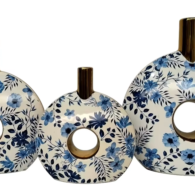 แจกันพอร์ซเลนสีขาวน้ำเงินขอบทองแบบพรีเมี่ยมพร้อมศิลปะดอกไม้อุณหภูมิสูงสำหรับคอลเลกชันมรดกสืบทอดและการจัดแสดงที่หรูหรา