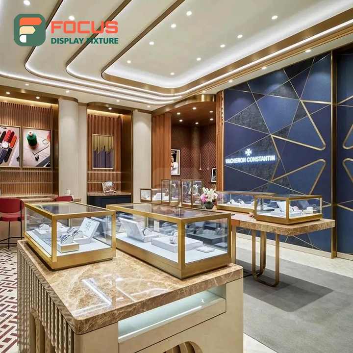 ตู้โชว์กระจกพรีเมียม ฐานไม้ โครงโลหะ หลายชั้น ไฟ LED คุณภาพสูง สำหรับโชว์รูมเครื่องประดับทอง ดีไซน์ภายใน