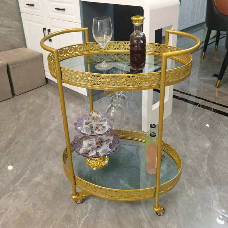 รถเข็นเหล็กเคลือบทองพรีเมียมพร้อมชั้นวางสองชั้น รถเข็นเสิร์ฟแบบมีล้อ สำหรับใช้ในบ้าน ห้องครัว ห้องรับประทานอาหาร เฟอร์นิเจอร์ตกแต่ง