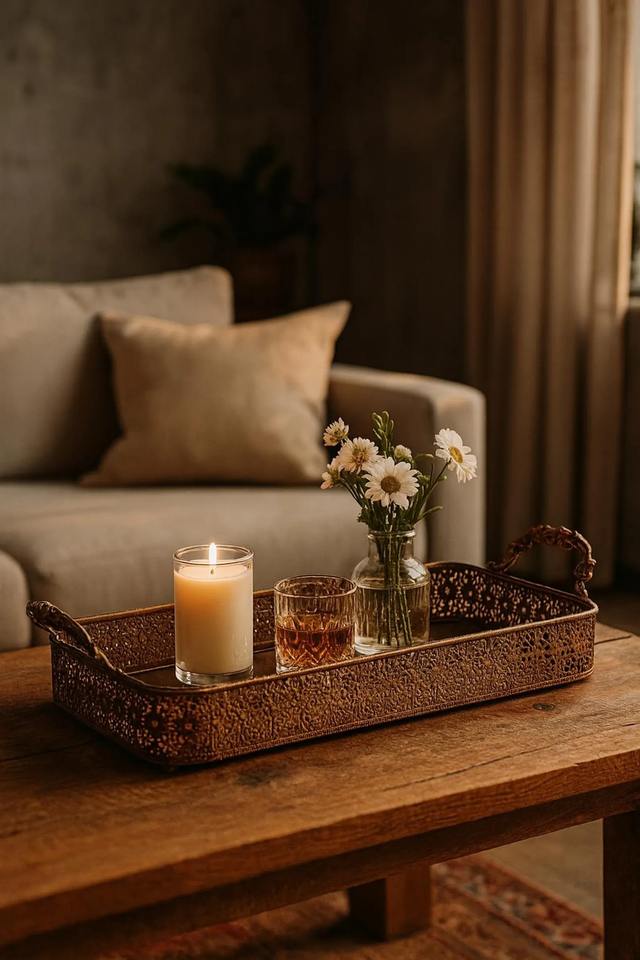 ถาดโลหะเคลือบทองพรีเมียม ตกแต่งลายฉลุ พร้อมหูจับด้านข้าง เหมาะสำหรับโต๊ะกาแฟในห้องนั่งเล่น และใช้รับรองแขก จากประเทศอินเดีย