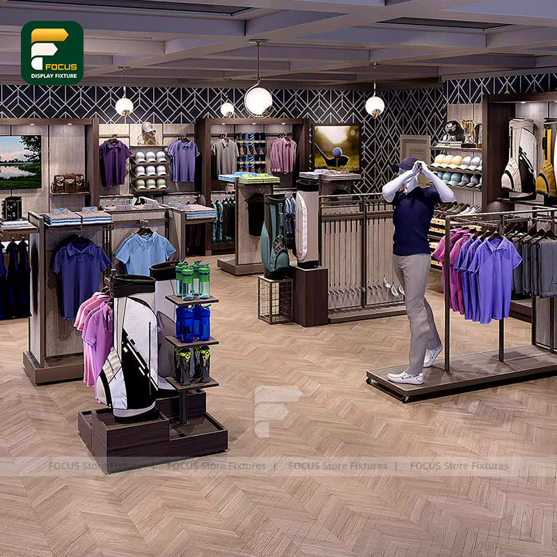 ชั้นวางแสดงสินค้าขายปลีกสำหรับร้านกอล์ฟที่ตั้งโชว์เสื้อผ้ากีฬาเฟอร์นิเจอร์ร้านขายอุปกรณ์กีฬาแบบสั่งทำได้