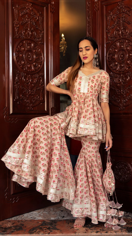 ชุดชราร่าห์ผ้าฝ้ายบล็อกมือลูกพีชเกรดพรีเมี่ยมพร้อมตาข่ายนุ่ม dupatta และกระเป๋า potli ชุดชาราดีไซน์ดอกไม้