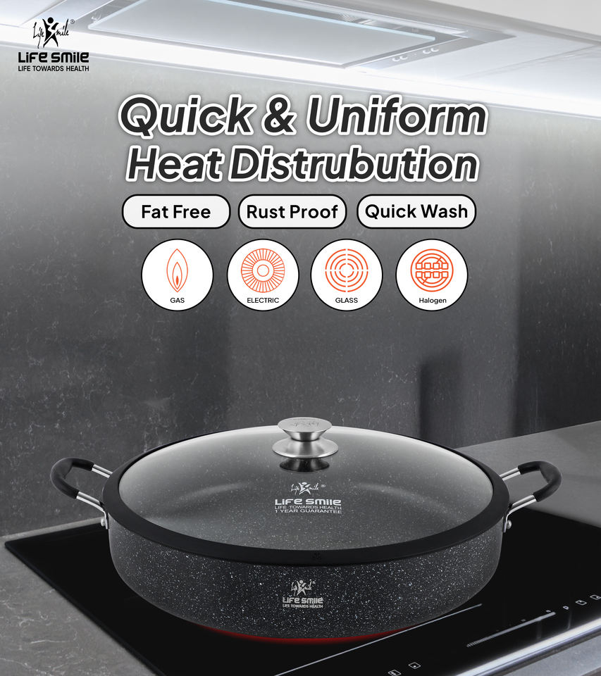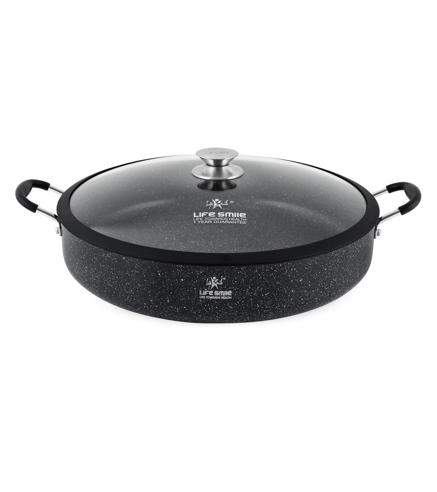 หม้อตื้นเคลือบหินแกรนิตคุณภาพพรีเมียม พร้อมฝาแก้วและขอบซิลิโคน