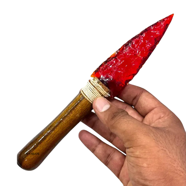 ด้ามมีดหัวลูกศรทำจากหินออบซิเดียนสีแดงขนาด 8 นิ้ว แกะสลักด้วยมืออย่างประณีต พรีเมียม เหมาะสำหรับสะสม ใช้ในพิธีกรรม หรือเป็นอาธาเม มีจำหน่ายแล้ว