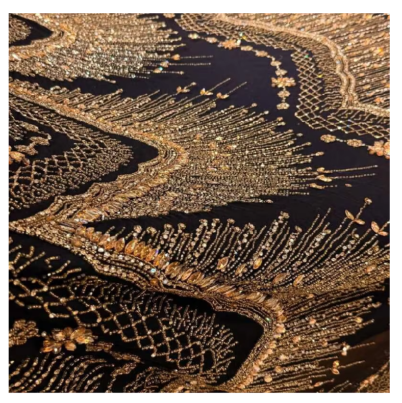 ผ้าลูกไม้ประดับลูกปัดปักด้วยมือระดับพรีเมี่ยมสำหรับ lehenga มีขอบมุกและคริสตัลผ้าโปร่งสำหรับชุดเจ้าสาวตามสั่ง