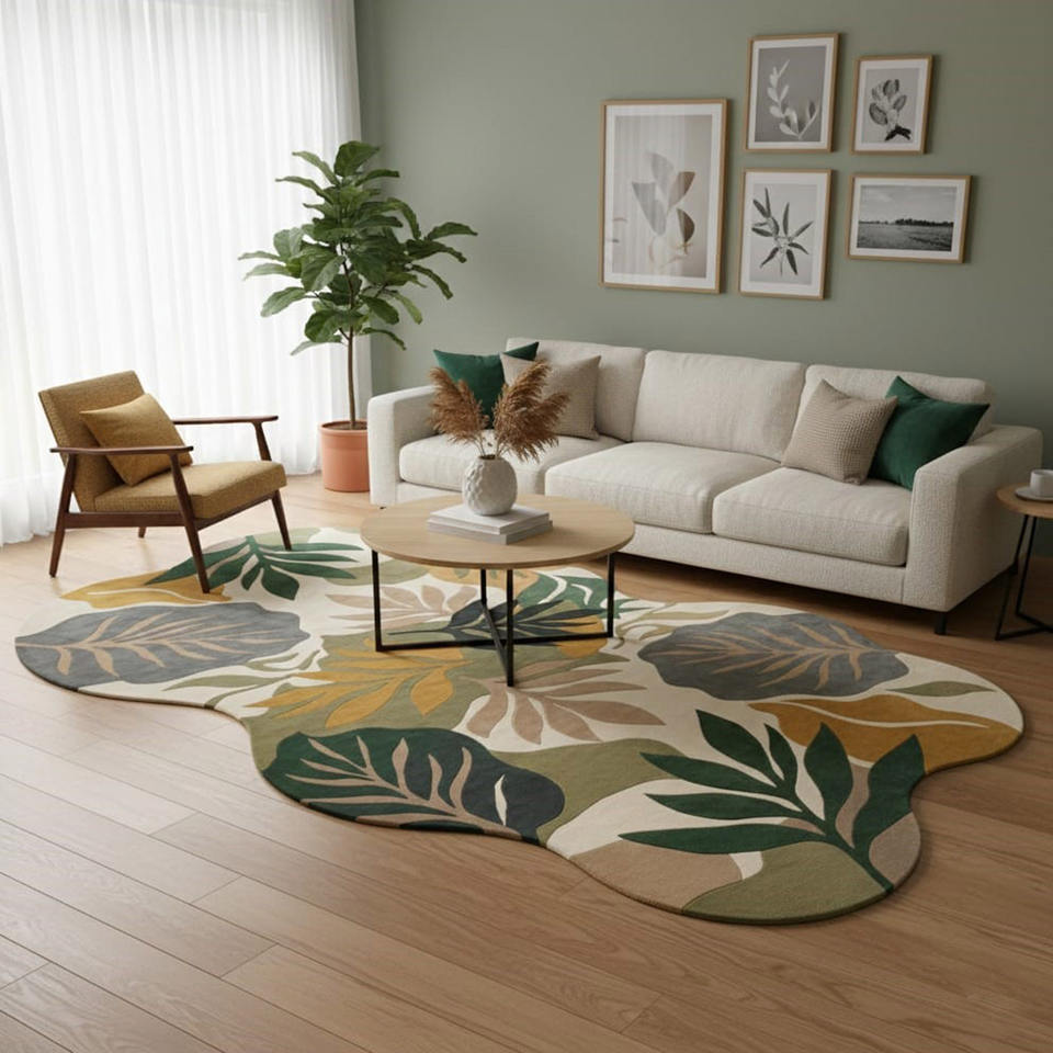 พรมขนสัตว์ทอมือคุณภาพพรีเมียม ลายใบไม้แบบนามธรรม ผลิตจากขนสัตว์ออร์แกนิก สำหรับตกแต่งห้องนั่งเล่น พร้อมแผ่นรองยางพารา เหมาะเป็นของขวัญปีใหม่