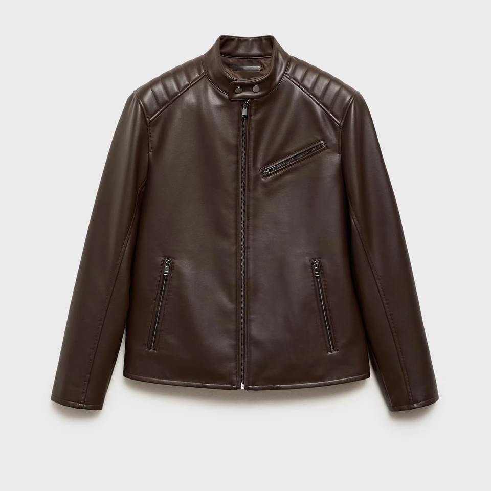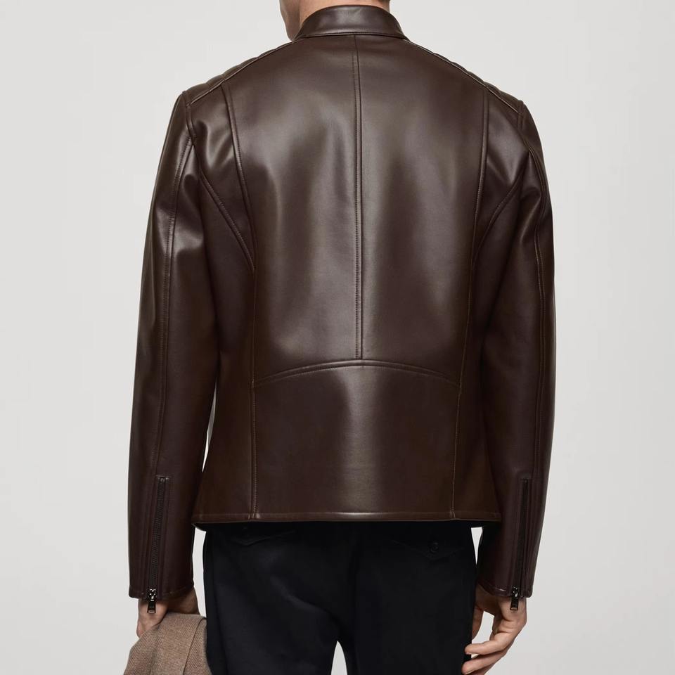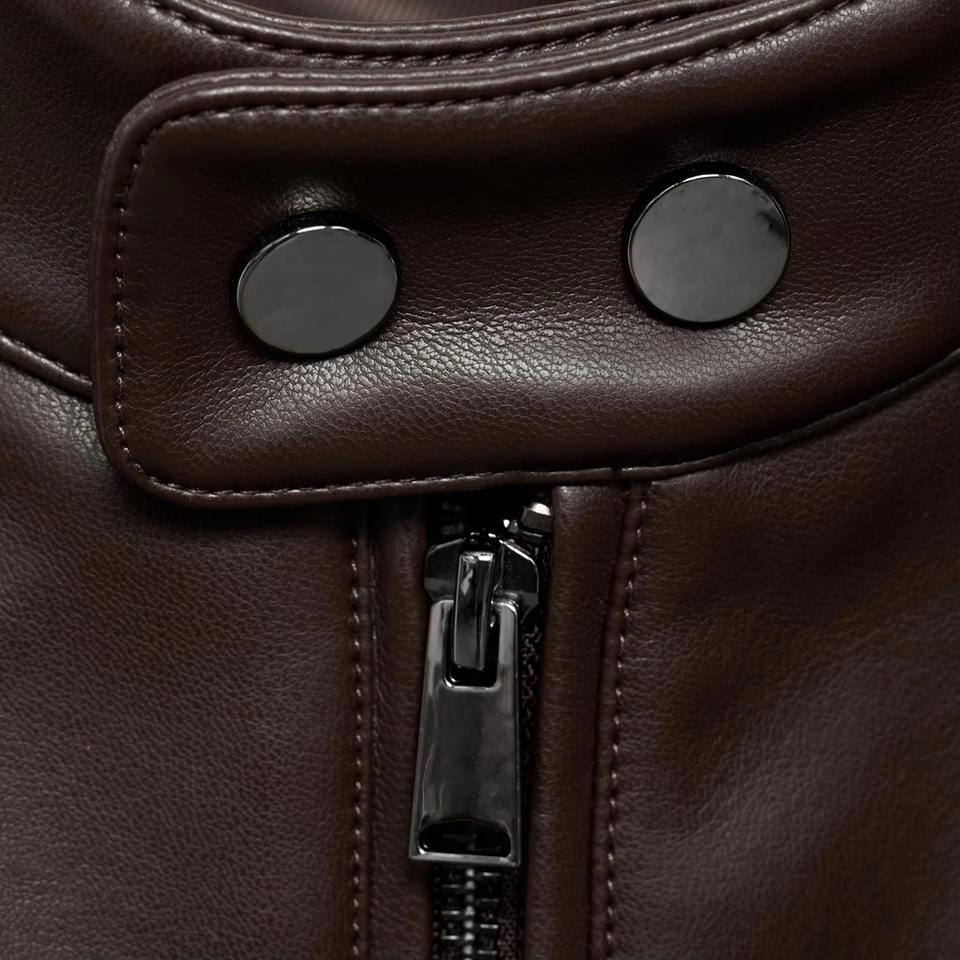 แจ็กเก็ตหนังโมโตแบบเรียบสีน้ำตาลงานฝีมือระดับพรีเมี่ยมมีสไตล์เมืองที่ทันสมัยพร้อมรายละเอียดที่เรียบง่าย