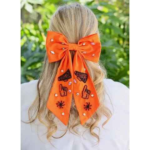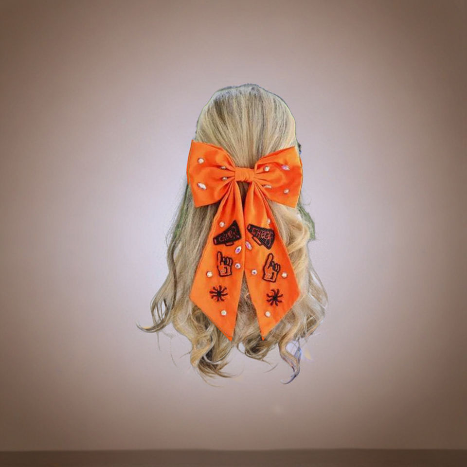 โบว์ติดผมงานปักมือระดับพรีเมียม ดีไซน์ประดับคริสตัลสีส้ม สำหรับวันแข่งขันกีฬา ขนาดใหญ่พิเศษ ผลิตจากผ้าเนื้อนุ่ม ทนทาน