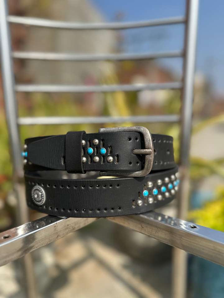 Premium Handcrafted Vintage Studded Cow Hide Leather Belt with Hair-On Design Heavy Duty Steel Pin Buckle and 1-1.5inches Width
