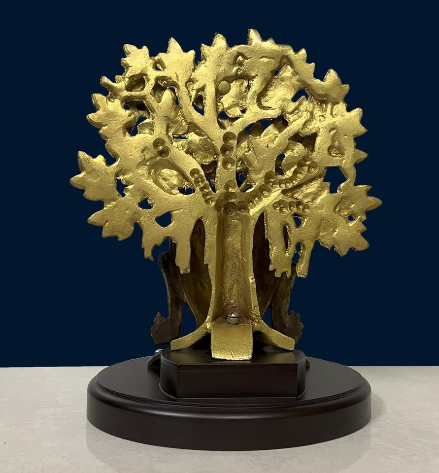 พระพุทธรูปทองเหลืองพร้อมต้นไม้บนฐาน