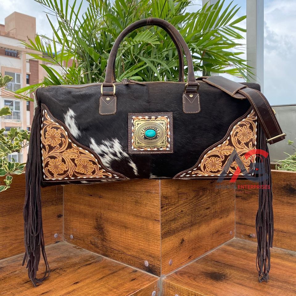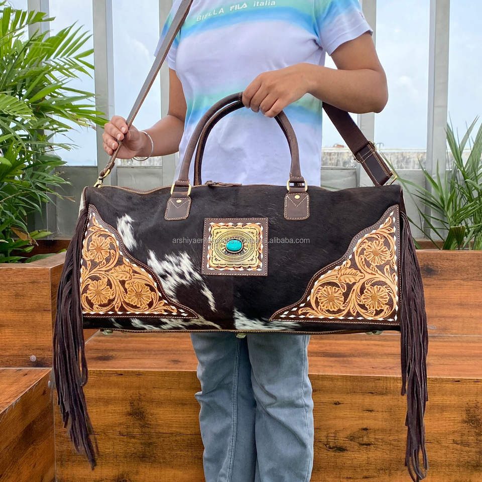Product name:Hand Tooled Cowhide Leather Fringe Duffle Bag