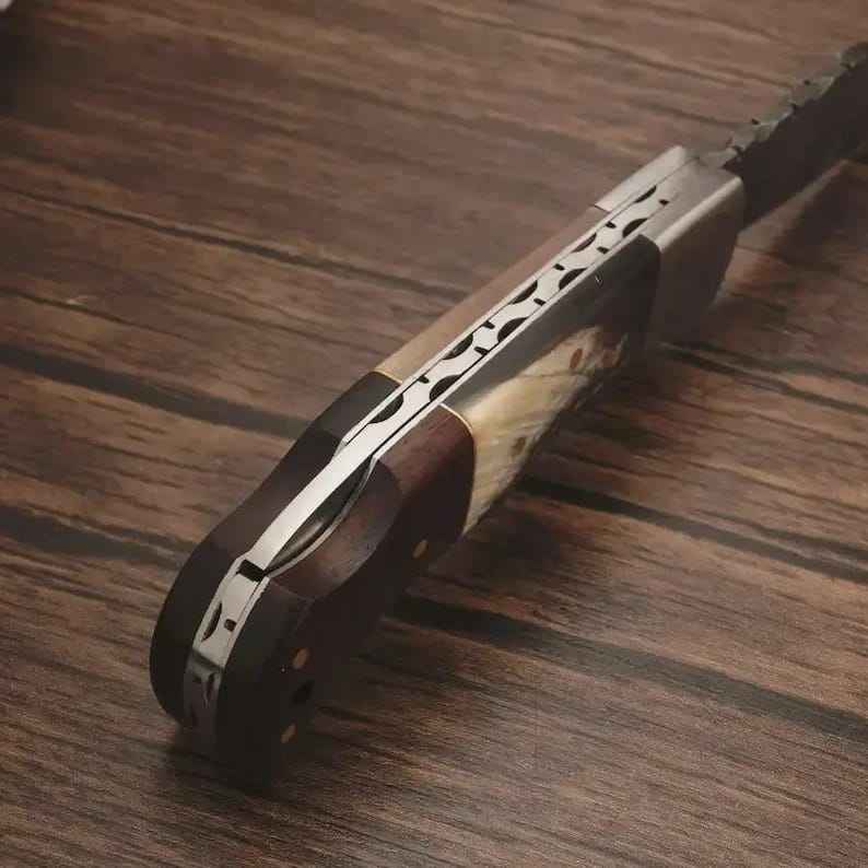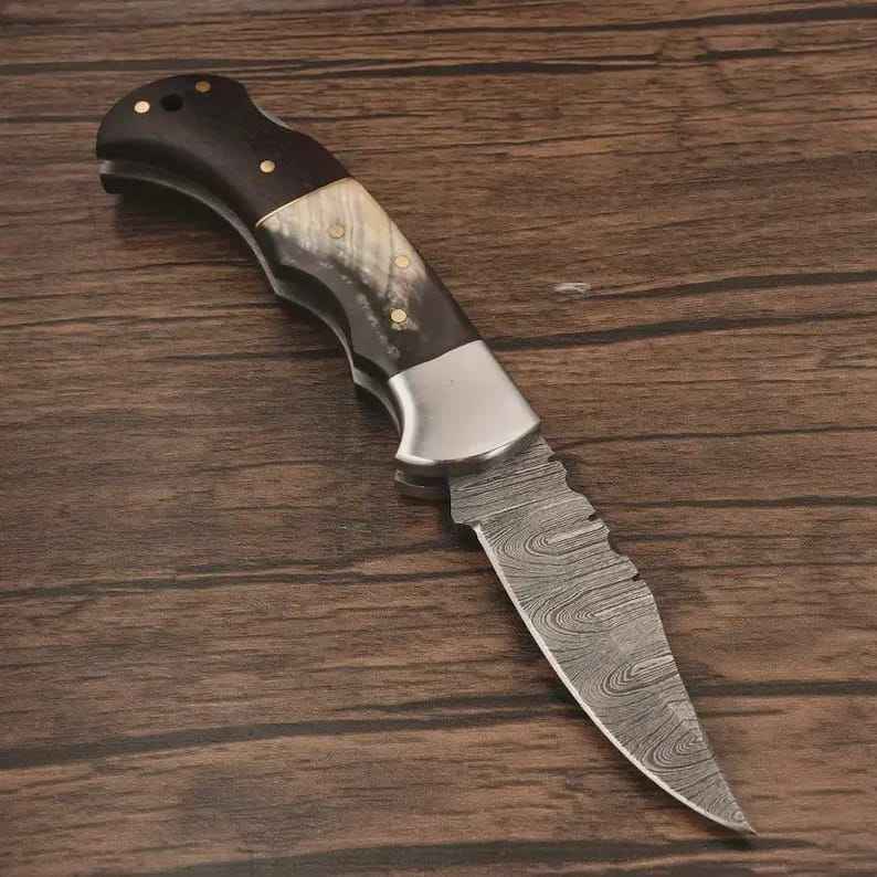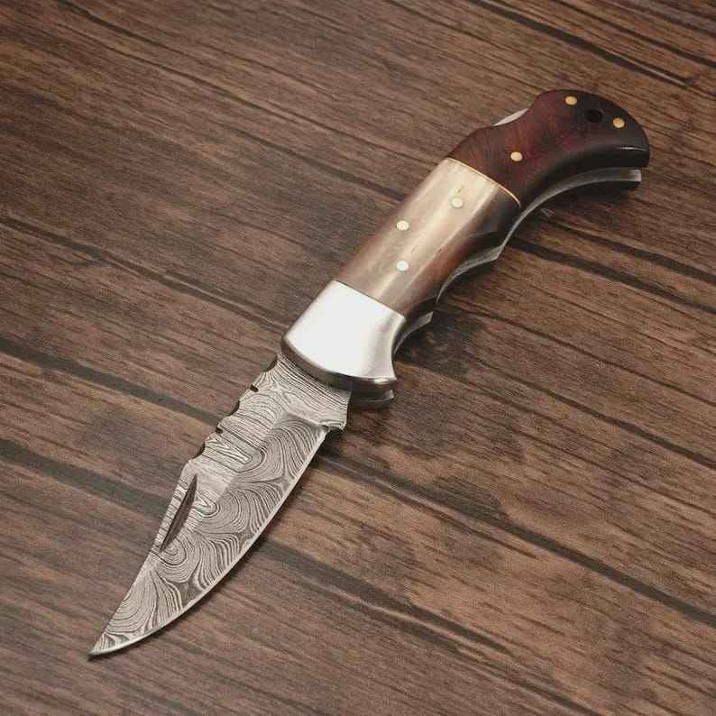 มีดพับดามัสกัสทำมือระดับพรีเมียม ด้ามไม้ คุณภาพอุตสาหกรรม สำหรับกิจกรรมกลางแจ้ง แคมป์ปิ้ง พร้อมปลอก สามารถปรับแต่งได้
