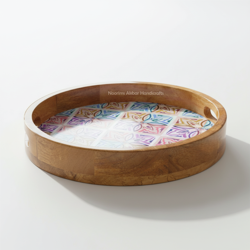 ถาดไม้มะม่วงเสิร์ฟอาหารสไตล์โมเดิร์นแบบทำด้วยมือของตกแต่งโต๊ะในโรงแรมถาดกลมขายส่ง