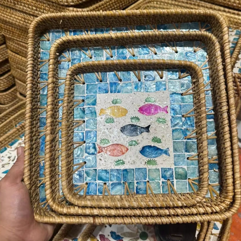 ถาดหวายสานมือคุณภาพพรีเมียม ประดับมุก สำหรับเสิร์ฟบนโต๊ะกาแฟ ผลิตในเวียดนาม