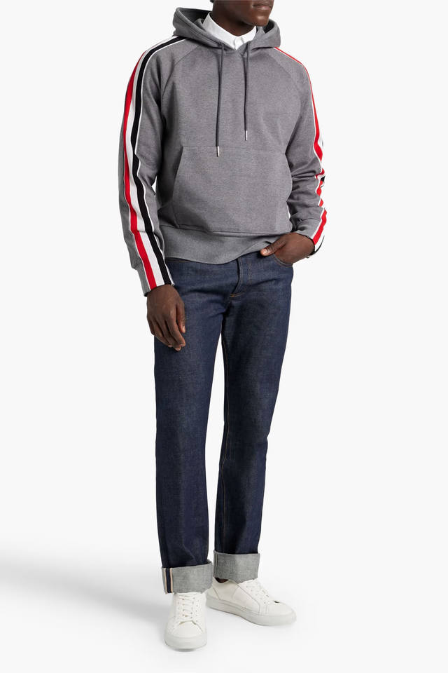 เสื้อมีฮู้ดน้ำหนักมากแบบพรีเมี่ยมสำหรับผู้ชายเสื้อมีฮู้ดสีเทาพร้อมแขนลายแถบสีมีสไตล์และสวมใส่สบาย