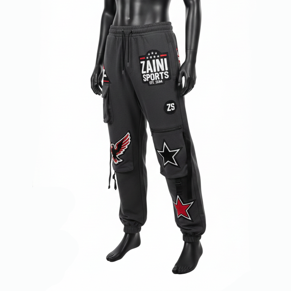 กางเกงจ็อกเกอร์ผ้าฟลีซเนื้อหนาพรีเมียม ผ้าฝ้ายผสมโพลีเอสเตอร์ สีดำ-เทา ดีไซน์แผงสี ปักโลโก้ตามสั่ง กางเกงจ็อกเกอร์ผู้ชาย