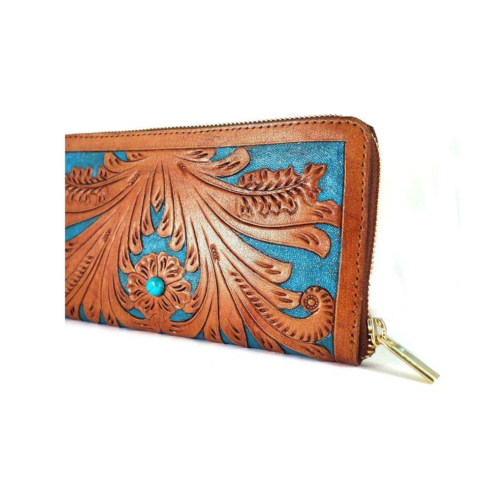 กระเป๋าคลัทช์หนังแท้สีน้ำตาลวินเทจลายดอกไม้ประดับเทอร์ควอยซ์ งานแฮนด์เมด พร้อมซิปปิด ดีไซน์สวยหรู ขายดี