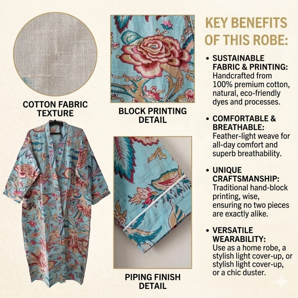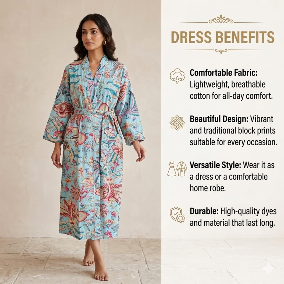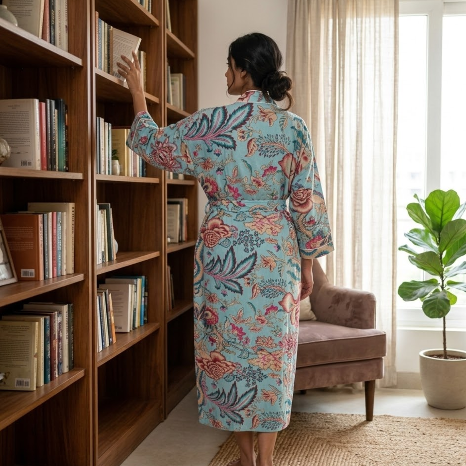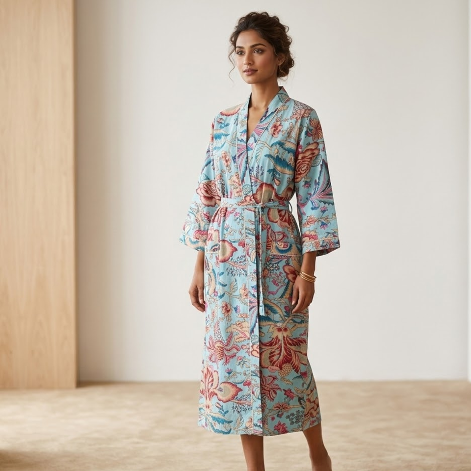 ชุดกิโมโนผ้าฝ้ายลายดอกสีครามพรีเมียมสำหรับผู้หญิง | ชุดคลุมอาบน้ำพิมพ์ลายด้วยมือพร้อมกระเป๋า | ชุดนอนแขนยาวคอวี