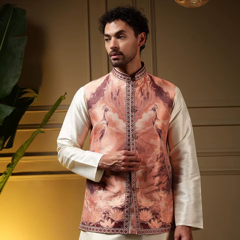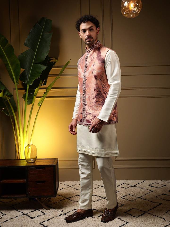 ชุดโคติคุรตาผ้าแจ็คการ์ดพรีเมียมแบบทอ 3 มิติ พร้อมกางเกงผ้าไหมสลับลายสำหรับผู้ชาย