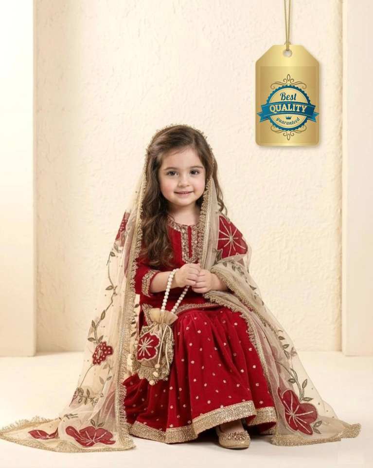 ชุดชาราร่าผ้าไหมพรีเมียมสำหรับเด็ก พร้อมงานปักหนักและผ้าคลุมไหล่ผ้าออร์แกนซ่า – ชุดสำหรับงานเทศกาลและงานแต่งงาน