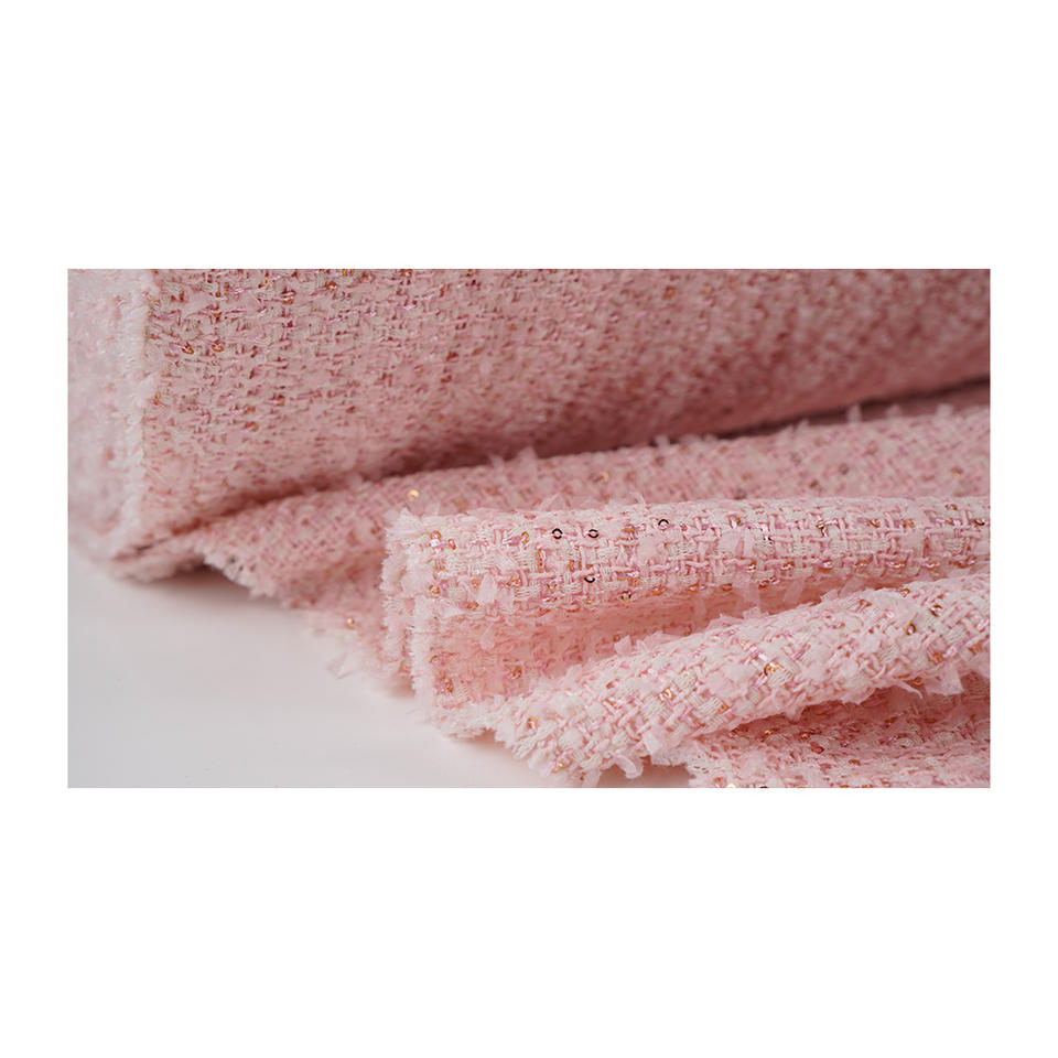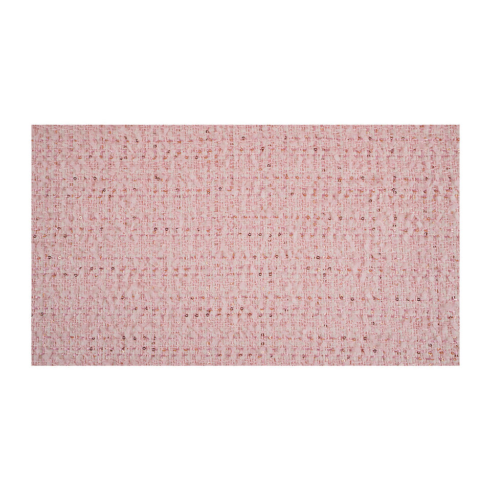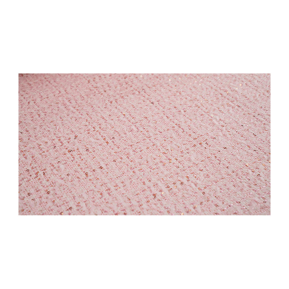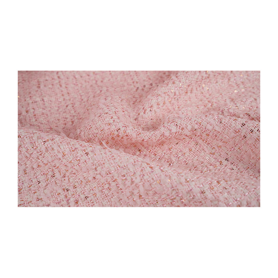 ผ้าทวีดแฟนซีคุณภาพพรีเมียม ผลิตในเกาหลี สีชมพู แต่งตาข่ายเมทัลลิก ทอลายแฟนซี รับผลิตแบบ OEM และ ODM ผ้าทอสั่งทำพิเศษ
