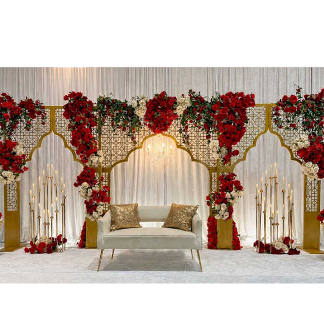 ซุ้มโค้งโลหะตัดด้วยเลเซอร์ระดับพรีเมียมสำหรับตกแต่งเวทีงานแต่งงาน ฉากหลังหรูหราสำหรับจัดงานแต่งงาน ชุดโซฟาดีไซน์เนอร์ แผงฉากหลัง ผลิตในสหรัฐอเมริกา