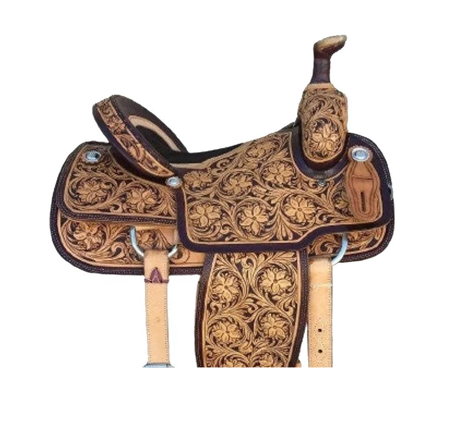 ชุดอานม้าสำหรับแข่งบาร์เรลเรซซิ่งแบบตะวันตก ทำจากหนังย้อมสีน้ำตาลและดำ ลายดอกไม้เพ้นท์มือ โครงไฟเบอร์ ขนาด 10" 18"
