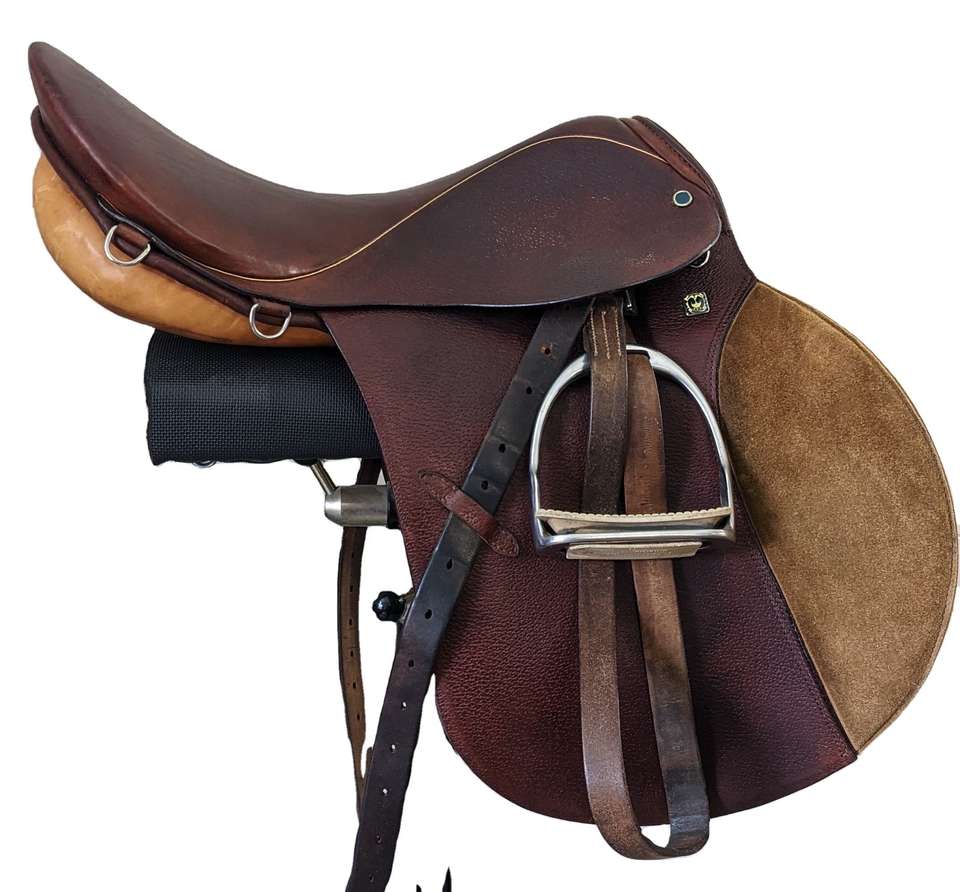อานม้าหนังแท้พรีเมียมสำหรับเดรสสาจ พร้อมแผ่นรองเข่าหนังกลับ ขาตีนตะขาบปรับได้ สะดวกสบาย ทนทาน อะไหล่ทองเหลืองชุบนิกเกิล